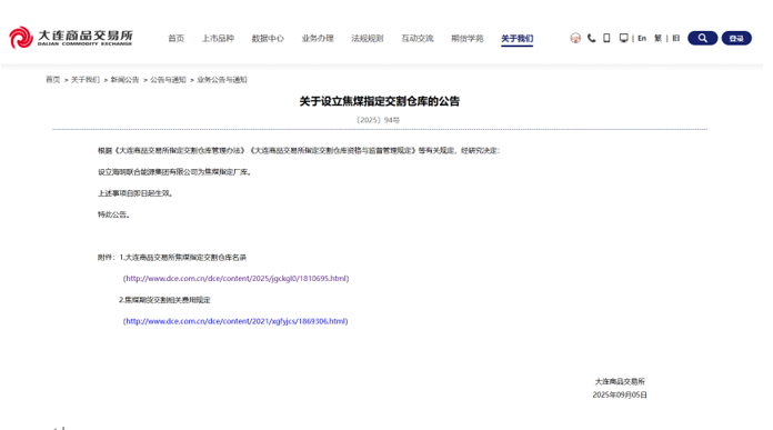 2025年9月5日,大连商品交易所(以下简称“大商所”)发布公告:Ezpay能源集团有限公司成为大商所焦煤指定厂库。